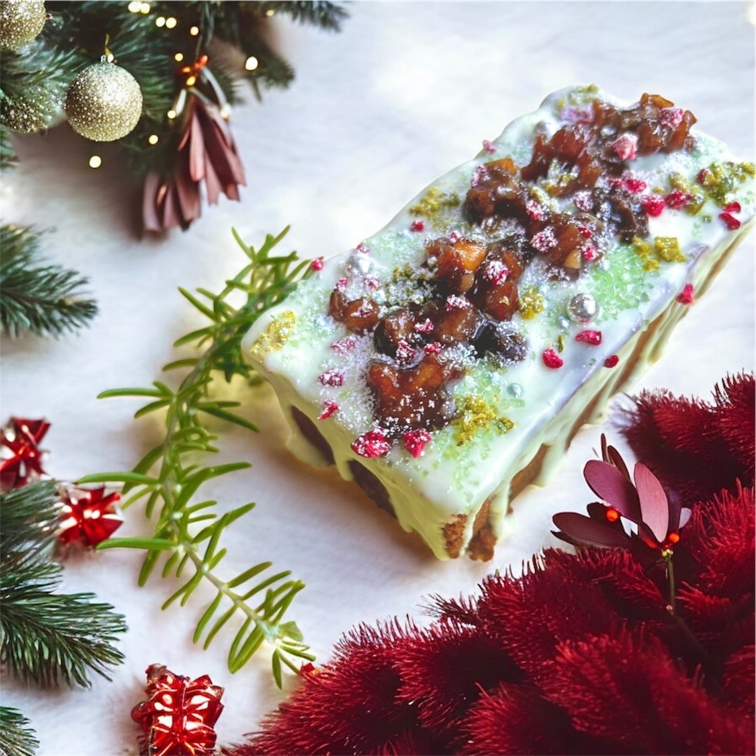 シュトーレン/自家製ミンスミート(胡桃、レーズン、オレンジ、レモン、りんご、スパイス、ラム酒、梅、牛脂)米粉、無塩バター、きび糖、卵、ベーキングパウダー、ホワイトチョコ、ドライフランボワーズ、ピスタチオ、アラザン、グリーンシュガー、粉糖